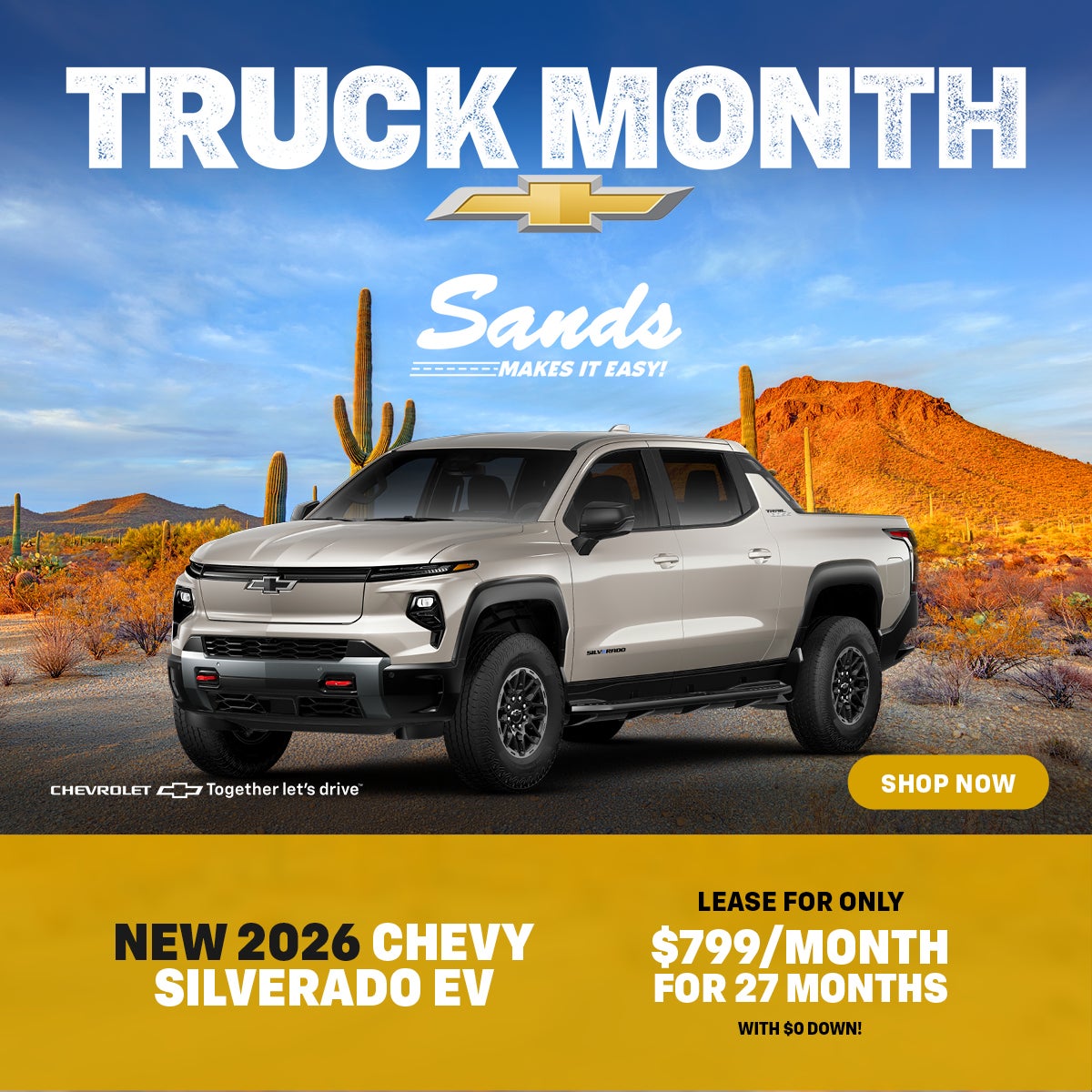 **5 or more availible at this offer. Lease for Well-Qualified Lessees - $799/month for 27 months. $0 Due at Signing. Tax, title, license, and dealer fees extra. $0 security deposit. Mileage charge of $0.25 /mile over 22,500 miles. Payments are for a 2026 CHEVROLET Silverado EV 4WD LT with an MSRP of $59,354. Option to purchase at lease end for an amount to be determined at lease signing. Lessor must approve lease. Take new retail delivery by 04-30-2026. Lessee pays for maintenance, repair, excess wear and disposition fee of $395 or less at end of lease. No security deposit required. Payments may be higher in some states. Not available with other offers.
