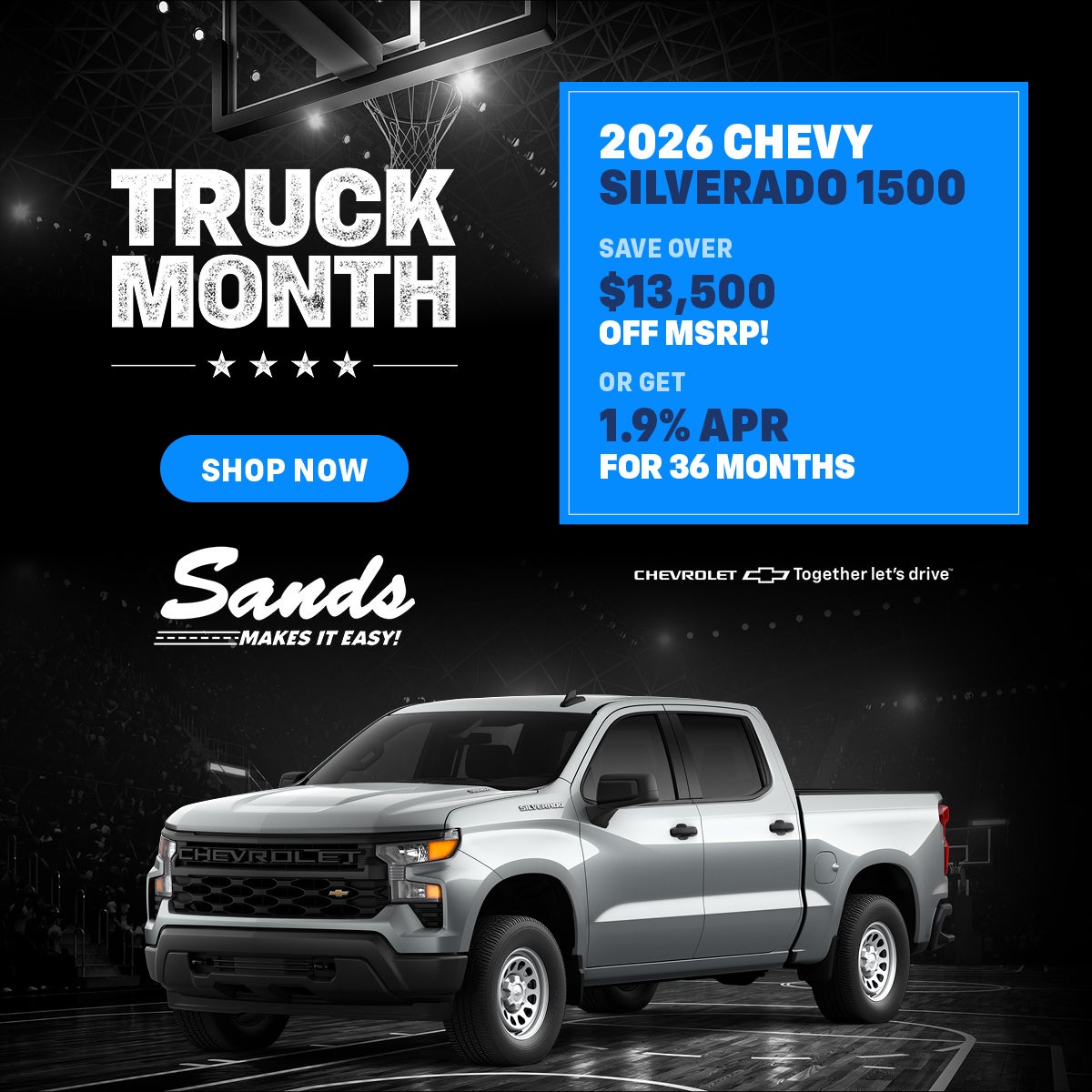 5 or more in stock and available at this total savings - Example #260899 New 2026 Chevrolet Silverado 1500 MSRP = $71484, Sands Discount - $9292, Customer Cash - $2500, Bonus Cash $750, Wholesale Club Member $1000. All prices and payments plus tax, title, license, and $599.50 doc fee. Vehicles subject to prior sale. Some customers may not qualify. Not available with lease and some other offers. Take new retail delivery by 3/31/26. "1.9% APR for 36 months for well-qualified buyers when financed w/GM Financial. Monthly payment is $28.60 for every $1000 you finance. Average down payment is 18%. Some customers will not qualify. Take new retail delivery by 03-31-2026."