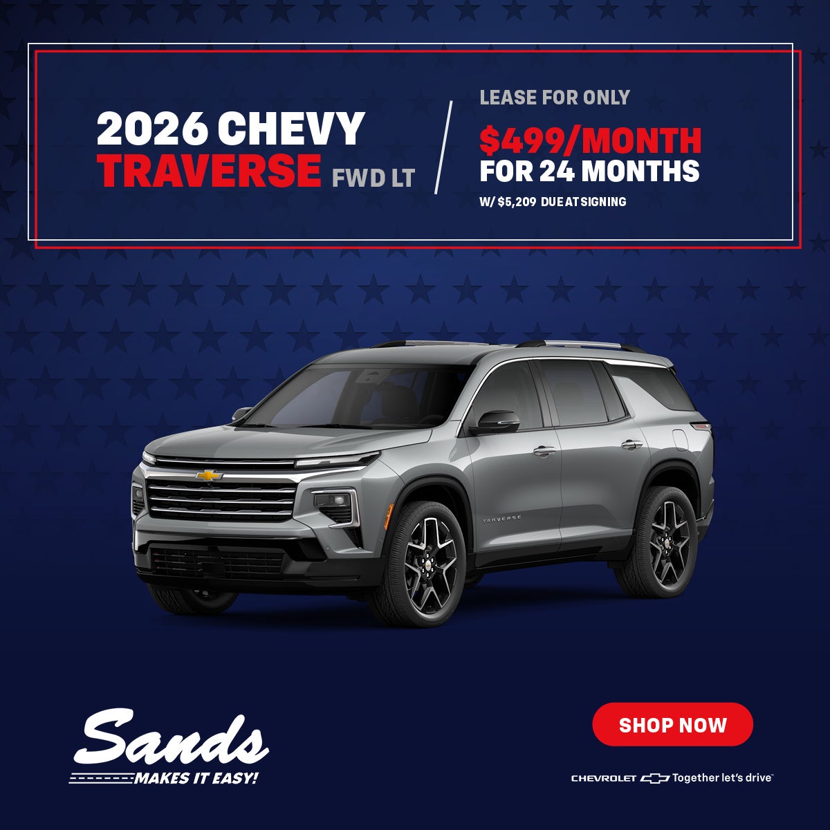 "Low-Mileage Lease for Well-Qualified Lessees.$499/monthfor 24 months.For Eligible Current Lessees:$5,209 due at signing (after all offers).**$0 security deposit.Tax, title, license, and dealer fees extra.Mileage charge of $0.25/mile over 20,000 miles at participating dealers.**For Current Lessees of a 2021 model year or newer GM or Non-GM passenger car or truck at least 30 days prior to the lease of a new GM vehicle through GM Financial. Customer remains responsible for current lease payments. Each dealer sets own price. $499/month for 24 months. Your payments may vary. Payments are for a 2026 CHEVROLET Traverse FWD LT with an MSRP of $42,695. Based on due at signing amount of $5,209 (after all offers). 24 monthly payments total $11,976. Must show proof of lease. Option to purchase at lease end for an amount to be determined at lease signing. Lessor must approve lease. Lessee pays for maintenance, repair, excess wear and disposition fee of $395 or less at end of lease. No security deposit required. Payments may be higher in some states. Not available with other offers. Take new retail delivery by 03-02-2026."